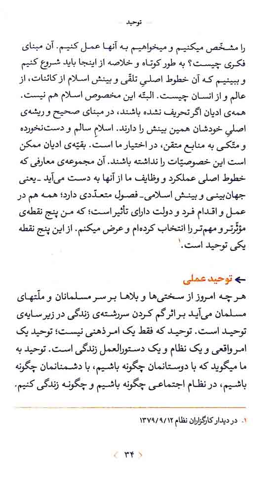 آن توحیدی که اسلام به آن دعوت میکند توحیدی است بالاتر از حد یک پاسخ به یک سؤال، به یک استفهام؛ پس چیست؟ توحید اسلامی الهامی است در زمینهی حکومت، در زمینهی روابط اجتماعی، در زمینهی سیر جامعه، در زمینهی هدف داری جامعه، در زمینهی تکالیف مردم، در زمینهی مسئولیتهایی که انسانها در مقابل خدا در مقابل یکدیگر، در مقابل جامعه و در مقابل پدیدههای دیگر عالم دارا هستند. توحید این است. توحید اسلامی همان الفی است که بعدش ب میآید و پ میآید و چ میآید تای میآید. این جور نیست که بگویی خدا یک است و دو نیست و تمام بشود. قضیه خدا یک است و دو نیست، معنایش این است که در تمام منطقهی وجود خودت شخصاً و جامعهات عموماً، جز خدا کسی حق فرمانروایی ندارد.