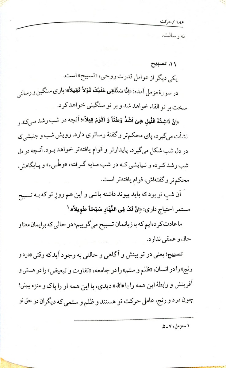 حرکت چیزی نیست که انسان بخواهد آن را ایجاد کند. او به هر صورت حرکت دارد و مهم این است که به آن شکل دهد. ضرورتی ندارد که حرکت را در خود ایجاد کنیم؛ چراکه این حرکت، این نیرو، این انگیزش در ما وجود دارد. باید این حرکت طبیعی را که در ما وجود دارد ساخت و بافت و ترکیب ما مایه گرفته، به سمت و جهتی هدایت کنیم.»
