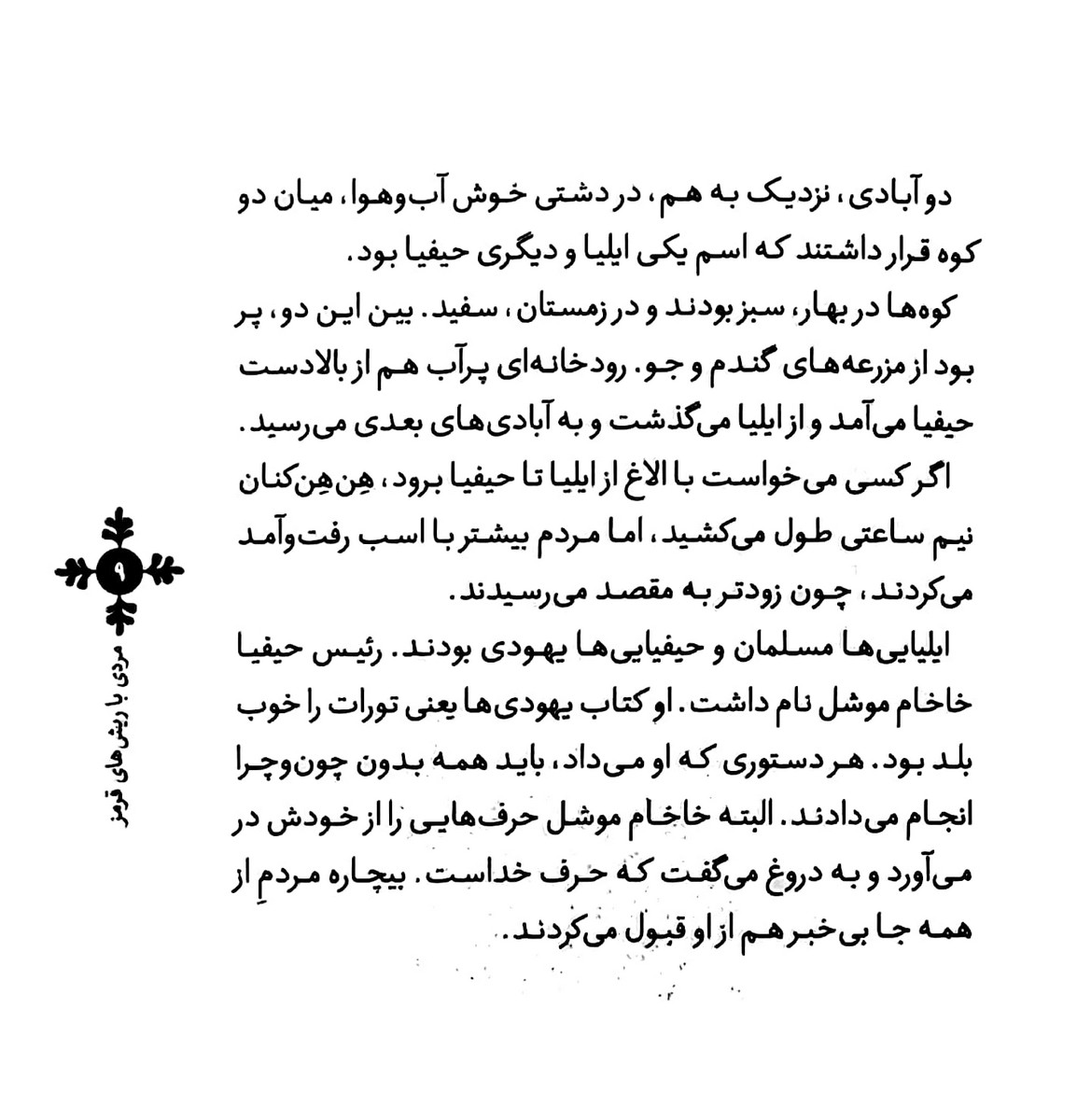 قصه در دو روستا یکی به نام ایلیا و دیگری به اسم حیفیا اتفاق میافتد؛ وقتی بگویم که در کتاب اول میفهمیم، رهبر مردم روستای ایلیا سید محمد و روستای حیفیا خاخام موشل است، هیجان انگیز تر هم میشود.
