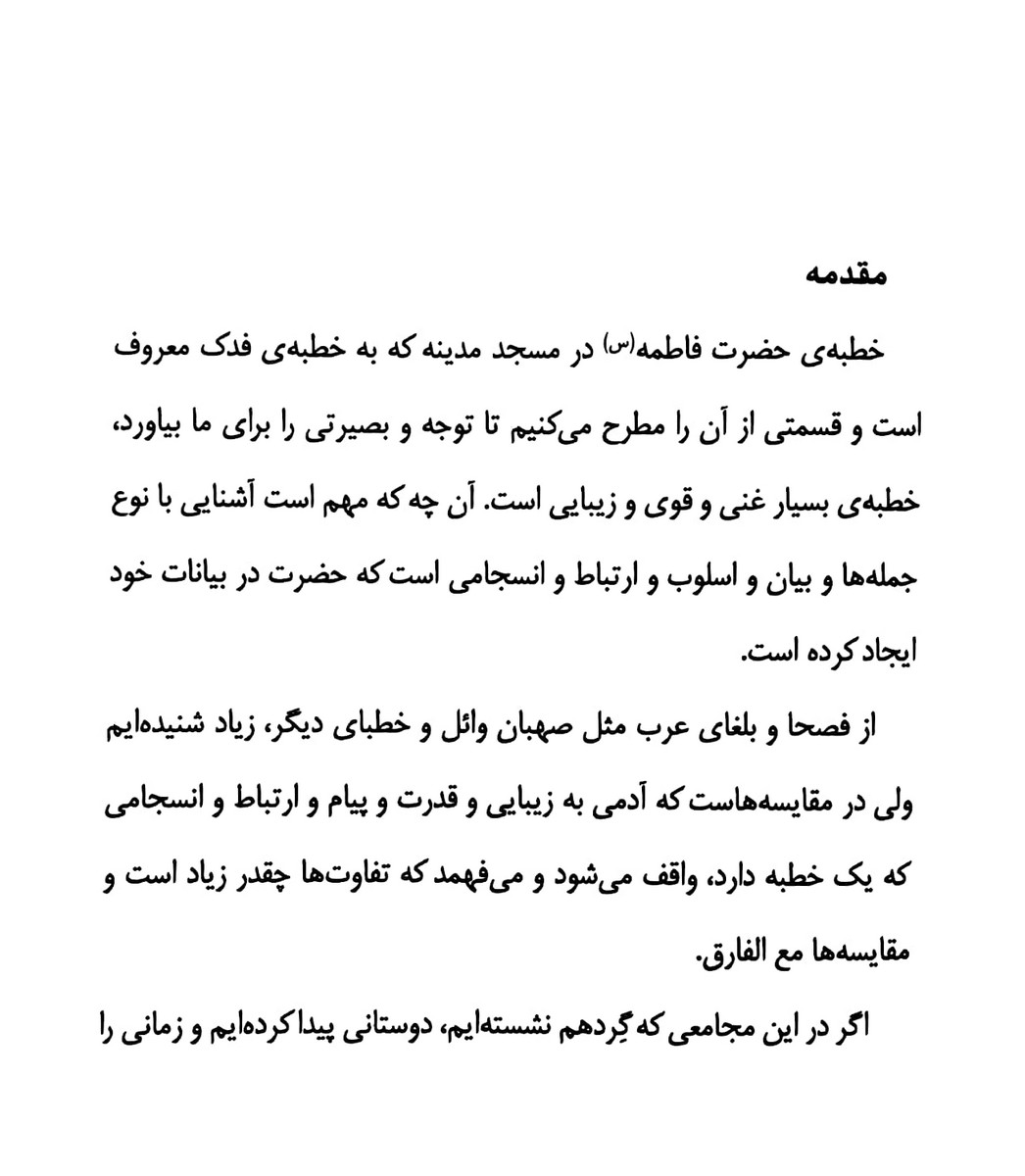 این اثر در سه بخش، ابتدا با شرح خطبه فدکیه به سوالات بنیادین خوانندگان پاسخ میدهند و در بخش دوم، با آوردن متن عربی و فارسی خطبه، فصاحت سخن صدیقه طاهره، به چشم میآید و در بخش پایانی اشعاری در رسای شهادت ایشان نگاشته شدهاست.