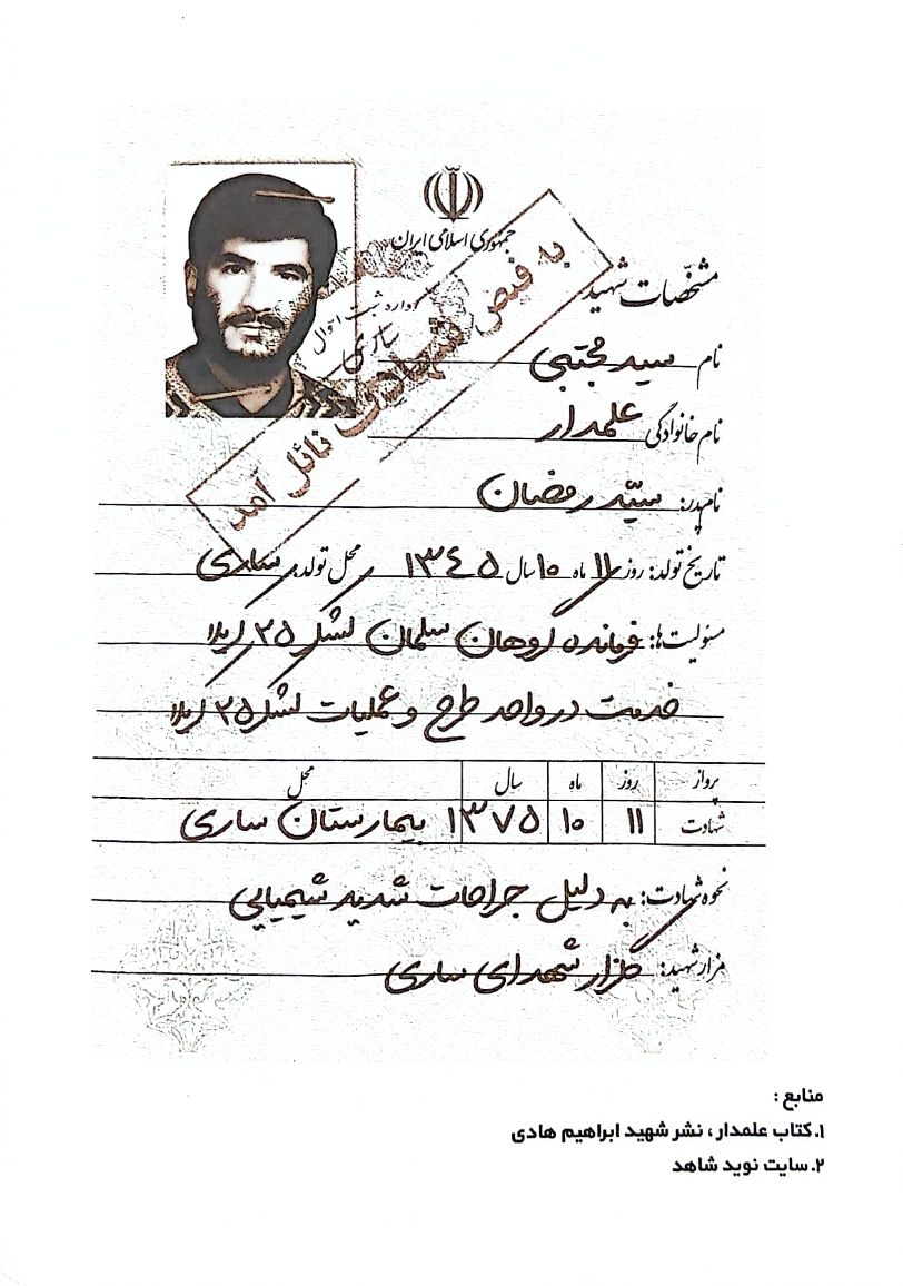 سید مجتبی علمدار فرمانده دلاور گروهان سلمان از گردان مسلم ابن عقیل و اهل شهر ساری بود شیرمردی که بارها و بارها زخمهای گلوله ها و ترکشهای دشمن تا دندان مسلح برتنش نشست؛ اما مردانه در میدان نبرد باقی ماند.