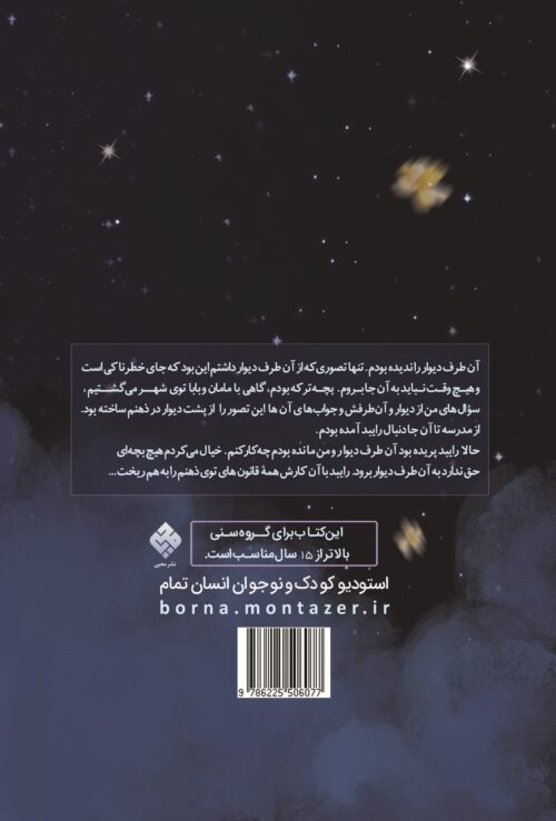 «آنطرف دیوار را ندیدهبودم. تنها تصوری که از آنطرف دیوار داشتم این بود که جای خطرناکی است و هیچوقت نباید به آنجا بروم. بچهتر که بودم، گاهی با مامان و بابا توی شهر میگشتیم، سؤالهای من از دیوار و آنطرفش و جوابهای آنها این تصور را از پشت دیوار در ذهنم ساختهبود. از مدرسه تا آنجا دنبال رایبد آمدهبودم. حالا رایبد پریدهبود آنطرف دیوار و من ماندهبودم چهکار کنم. خیال میکردم هیچ بچهای حق ندارد به آن طرف دیوار برود. رایبد با آن کارش همۀ قانونهای توی ذهنم را به هم ریخت.»