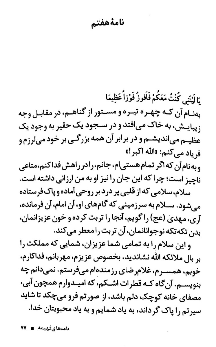 برای کامل کردن تصویر زن در دفاع هشت ساله ملت ایران در برابر یک تجاوز جهانی، اگر نگوییم راه درازی در پیش داریم، به یقین قدمهای بزرگی هم برنداشتهایم. مرحوم فهیمه بابائیانپور یکی از آن زنان ناشناخته بود که خورشید وجودش سالها در پشت ابرهای نازای تبلیغات باقی ماند و مثل نقش جهادی بقیه زنان نادیده انگاشته شد و این کتاب «نامههای فهیمه» اشعههایی از آن خورشید را برگرفته و در برابر چشمان شما قرار میدهد. کتاب دو بخش دارد. یادداشتهای فهیمه و نامهنگاریهای فهیمه با همسرش، شهید غلامرضا صادقزاده.