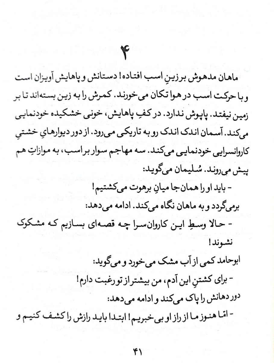 ((اینها قصّه نیست خالد. من جنگاوری علی را دیدهام. من رجز خواندنِ او را شنیدهام. من درباره جنگِ خونین او با اجنّه شنیدهام. من نه از خودِ علی، که از بادِ چرخش ذوالفقارش میترسم، آری؛ دشمن او هستم و مرگِ او را منتظرم. امّا اینگونه نیست که محمّد بمیرد و تو در میدانگاه برقصی و علی تماشا کند. هنوز چرخ اوّل رقصت تمام نشده، زنان و کودکانت بر خاک قبرت نشسته اند و برایت قرآن میخوانند!
