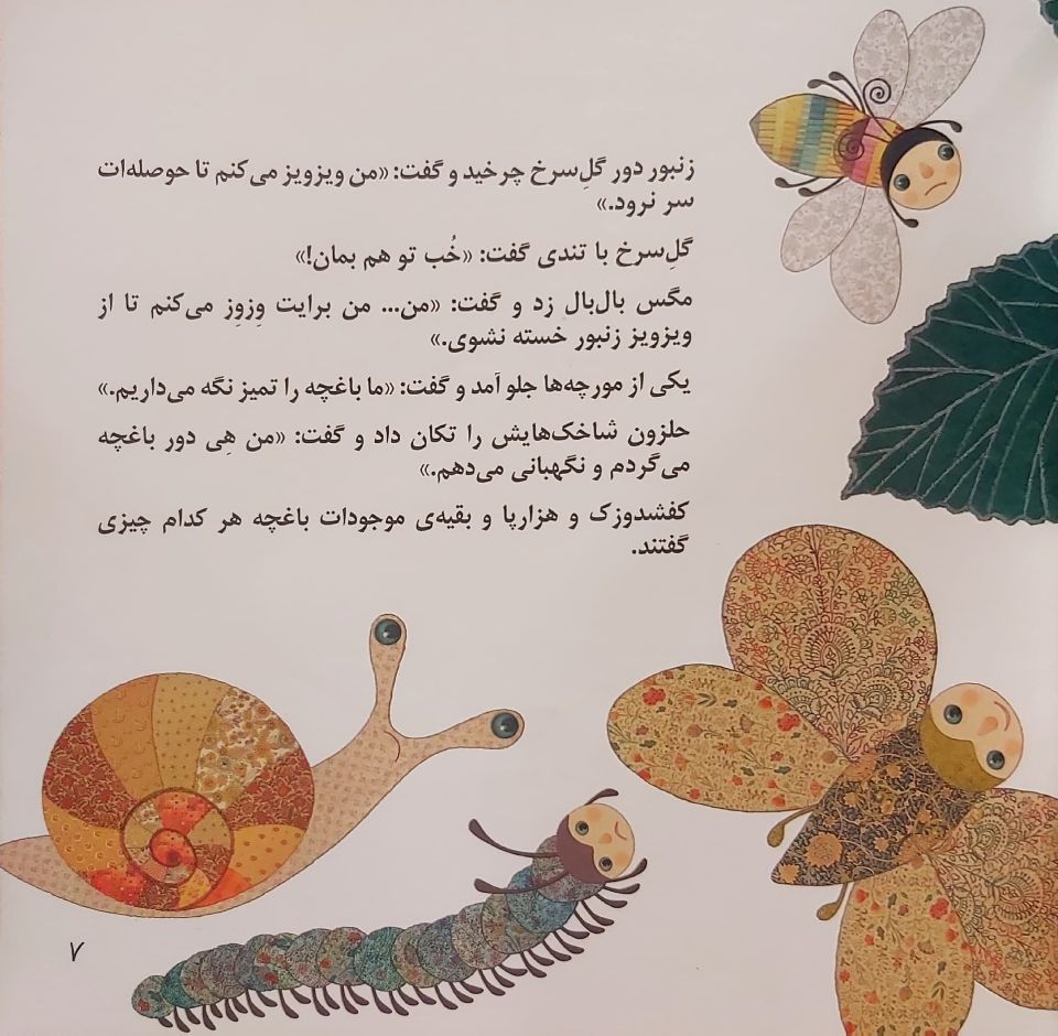 چند لحظه سکوت شد گل سرخ پرسید:«تمام شد؟ کسی نمانده؟» کرم خاکی از توی خاک بیرون آمد و گفت:«چرا من هم هستم ولی نمیدانم چه بگویم حتما به دردی میخورم ولی کدامش را نمیدانم گل سرخ عصبانی شد و فریاد کشید:«من توی باغچهام مفت خور نمیخواهم پس باید از این جا بروی همین حالا!» کرم خاکی شانه بالا انداخت و سرش را بالا گرفت و یواش یواش دور شد. حلزون با شاخکهایش از او خداحافظی کرد. بقیه این قدر برایش دست تکان دادند تا کرم خاکی دیگر دیده نشد.
