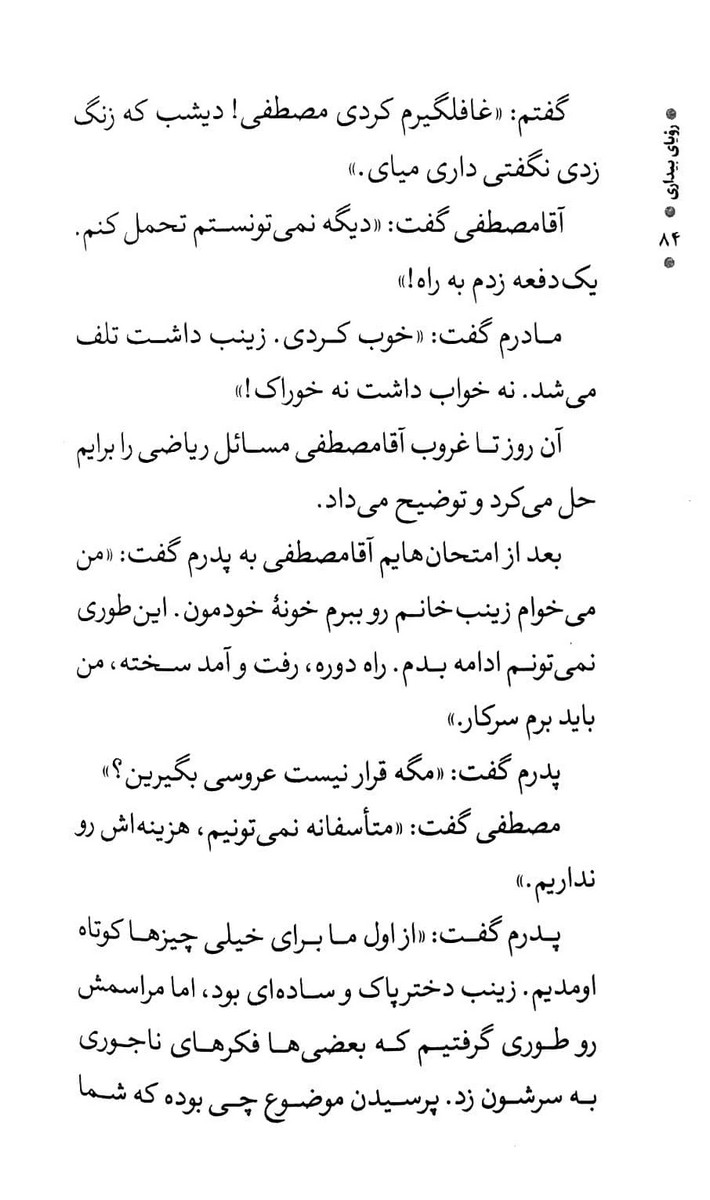 «امروز قبل از رفتن آقامصطفی یک نفر بهش گفته بوده تو چقدر ظالمی! چرا فکر زن و بچهات نیستی و هر کار دلت میخواد میکنی؟ آقامصطفی به من گفت از این حرف خیلی ناراحت شدم، نمیدونم چرا بعضیها این همه محبتی که من به تو و بچهها دارم رو نمیبینن؟ در عجبم اونا واقعاً درک نمیکنن که من بهخاطر دشمن مشترکی که زندگی و آیندهٔ همهمون رو تهدید میکنه دارم از سر اجبار وطنم رو ترک میکنم و به میدون جنگ میرم؟ به من که در گرمای چهلپنجاه درجه، بدون امکانات زندگی میکنم میگن ظالم؟ من به آقامصطفی گفتم چهطور به خودشون اجازه میدن اینطور صحبت کنن؟ میخواستی بگی این خانمها خودشون بند پوتین ما رو میبندن»
